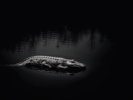 A black and white photo of an alligator in the water. Generative AI image.