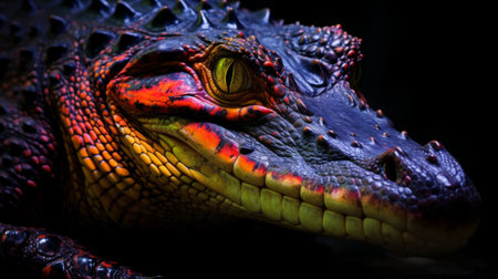 an alligator illuminated by bright lights in the dark, showcasing a grandiose color scheme of dark crimson and orange. the close-up intensity captures the alligator's strong facial expression, while the dark navy and green background adds a sharp and prickly atmosphere. the use of complementary colors enhances the visual impact of this captivating photo. ai generated