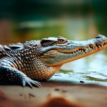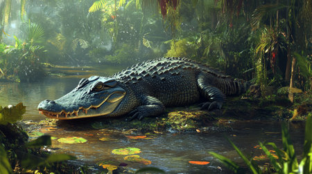 An AI generated illustration of an adult crocodile lies at the edge of a tranquil pond