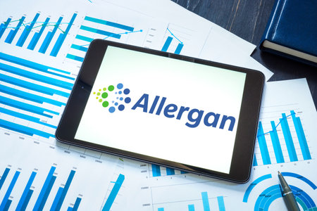 KYIV, UKRAINE - June 30, 2021. Tablet with allergan logo on the table.