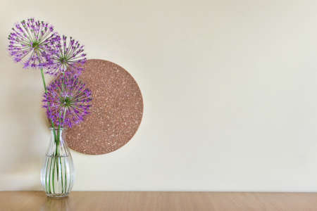 Blank wall mockup with simple composition with glass vase, pink summer flowers and round cork material. Image with blank wall.