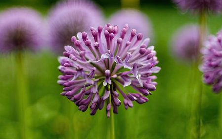 Purple allium lucy ball flowers in a field selective focus close up detail