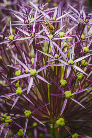 Allium, ornamental garlic inflorescence with numerous tiny flowers. The bee searches for pollen on the delicate flowers.