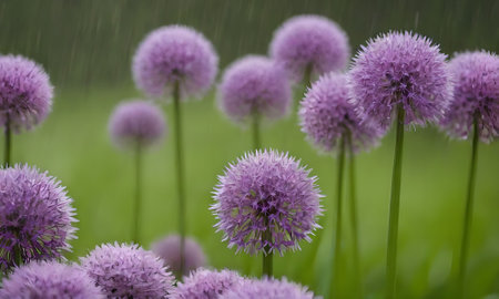 Purple Allium flowers on a meadow in the rain.