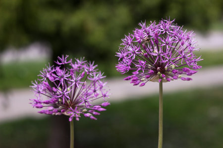 Blooming ornamental onion close-up outdoors, blurred background
