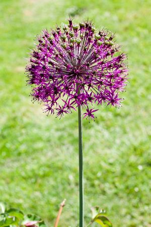 Purple flower decorative bow, close-up. The spherical allium flower can reach up to 15 centimeters in diameter. The concept of landscape design