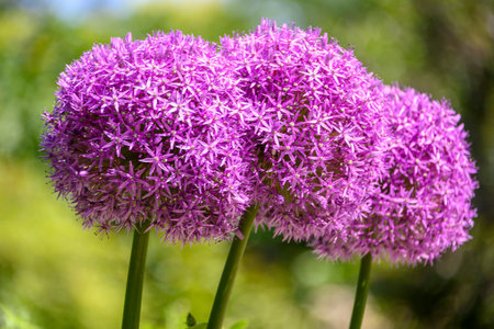 Beautiful purple Allium flowers in bloom. Close-up macro shot with a blurred, natural green background. Spring or summer floral scene. Perfect for nature or gardening projects.