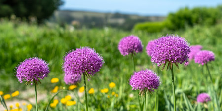 Purple allium flowers blooming beautifully in a sunlit summer meadow, showcasing garden elegance.