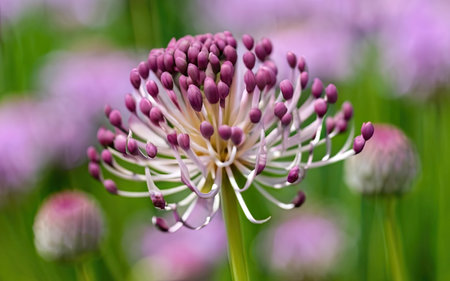 Ornamental onion also called german garlic , mountain garlic or allium , a globose flower with pale purple florets ,out of focus background