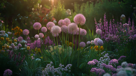 Beautiful view of purple and white allium flowers in the natural perennial garden