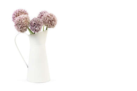 Pink onion flower over white background. On a green stalk. Lit brightly.