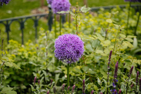 Tall purple spherical onion allium flowers growing in a flower bed.
