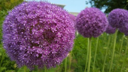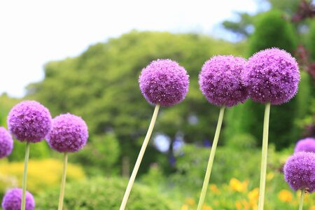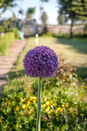 Allium flowers growing in the garden. Purple allium flowers. Round purple flowers look like a ball. Blooming onion.