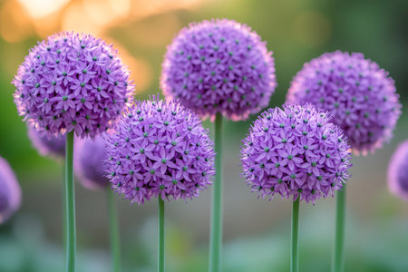 Vibrant purple allium flowers stand tall in a garden, bathed in the warm glow of the golden hour