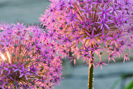 Purple flowers Ornamental Onion (Latin: Allium Gladiator) illuminated by the bright rays of the sun, close up.