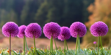 Vibrant allium flowers blooming in a green grassland on a sunny day, creating a beautiful scene.