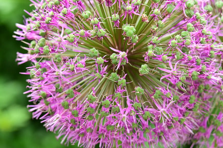 Spherical Allium Purple Sensation has faded in a flowerbed in a garden in a bright sunny day. Close-up of decorative blooming inflorescence Dutch Garlic. Onion with globe flowers on green background.