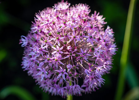 Beautiful blooming purple decorative onion allium flower in garden macro