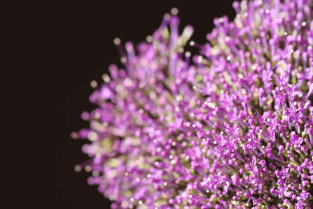 Beautiful Blooming pink flowers of allium aflatunense or ornamental onion on a black background. Flower head close-up.
