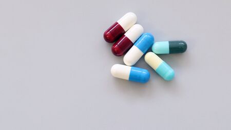 Colorful antibiotic capsule pills on white background. Pharmaceutics concept. Antibiotic drug resistance. Pharmaceutical industry. Pharmacy drugstore. Healthcare medication. Antimicrobial capsule.