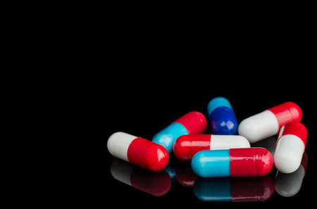 Pile of colorful capsule pills in blister pack on dark background. Drug policy and budgets. Antibiotic drug use with reasonable. Antibiotic drug resistance concept. Contraindications in pills.
