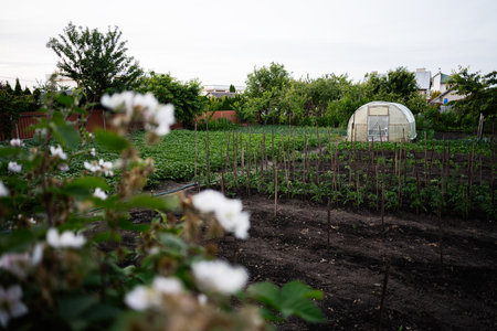 Lush vegetable garden featuring a greenhouse and wooden stakes for plant support