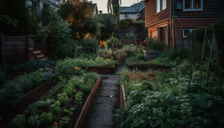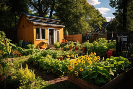 close-up of colorful flower garden with vegetable patches in the background, created with generative ai