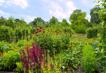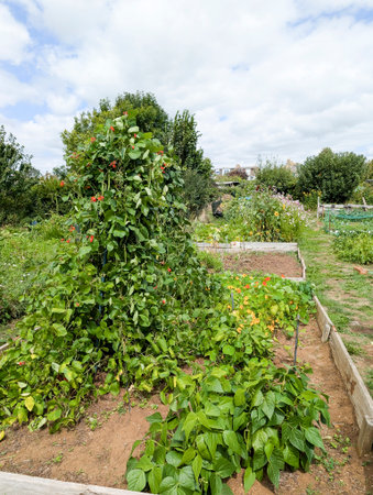 Explore a serene community garden featuring vibrant flowers and lush vegetables. This tranquil outdoor space highlights sustainable practices and fosters a connection to nature.