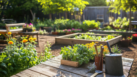 A vibrant community garden with raised vegetable beds, blooming flowers, and garden tools resting on a wooden table.