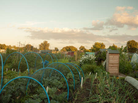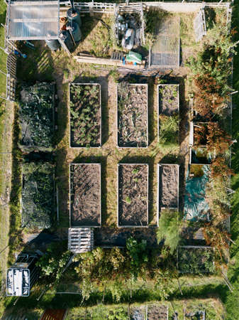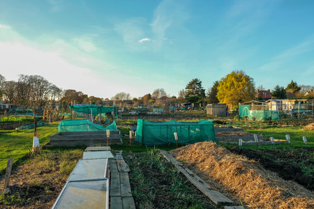 Shot of allotment in the fall, side view. An allotment is a small plot of land rented and used to grow your own vegetables.