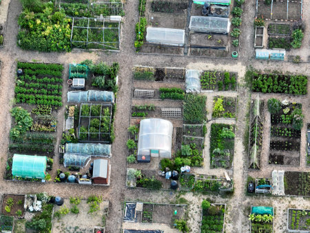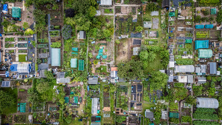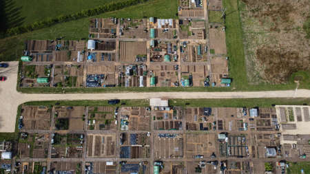 Aerial view of allotments for gardening and growing vegetables on smallholding. Alwoodley Allotment in West Yorkshire