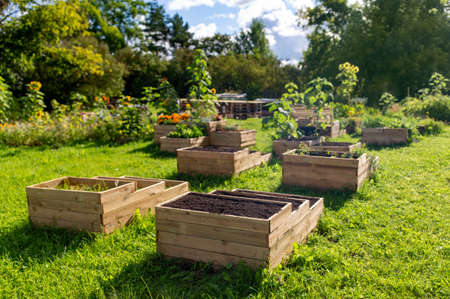 raised garden beds made in wooden boxes on farm