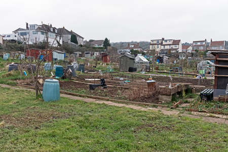 Weston-super-Mare, UK - January 25, 2022: Redpits allotments on a dull, grey winter afternoon