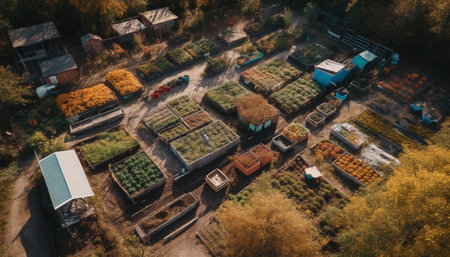 aerial view of a colorful, well-maintained vegetable garden, created with generative ai