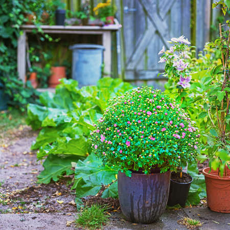 Pot plants and flowers in a backyard gardening area on a summer day. Lush green tropical foliage outdoors. A gardening area with colorful flora during spring. Beautiful greenery in the yard