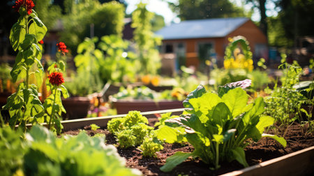 a community garden with blooming flowers and vegetables, providing a vibrant contrast against the greenery, created with generative ai