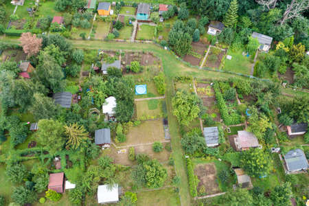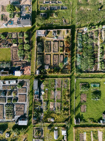 Aerial view of an urban vegetable garden in a small town.