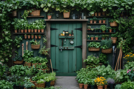 Potted plants, hanging baskets, and gardening tools create a vibrant and inviting atmosphere in front of a green door