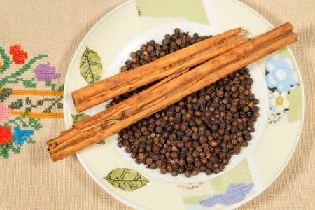 Small dish with black pepper grains and several cinnamon sticks on an embroidered cloth