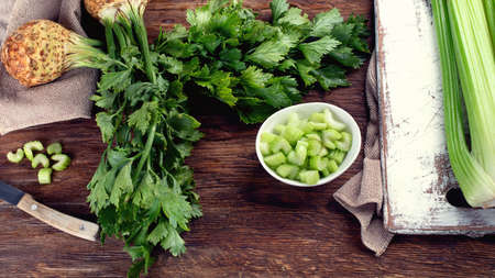 Raw green celery stalks on wood background top view. Fresh organic vegetables on old wooden rustic table with place for text or copyspace