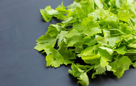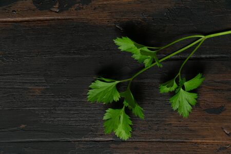 Fresh green parsley, cilantro on wooden rustic table. Top view.
