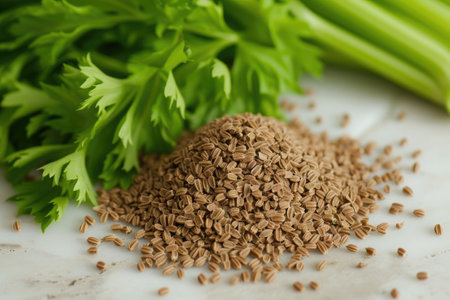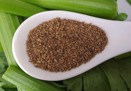 porcelain spoon with celery seeds on stick and organic celery leaves, top view