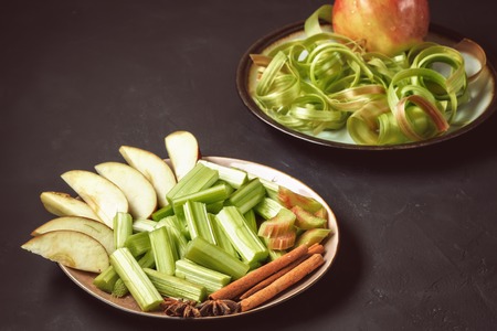 Sliced young rhubarb stems and fresh apple slices, peeled chips ingredients for jam salad compote food recipes healthy diet detox organic vegetables on wooden background