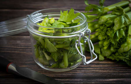 Raw green celery stalks on wood background top view. Fresh organic square vegetable frame on old wooden rustic table with copyspace