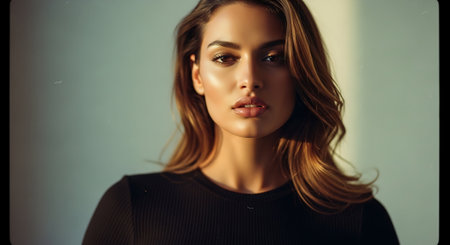 A young woman stands confidently with long, flowing hair and captivating blue eyes. She poses against a soft, textured backdrop, illuminated by warm, natural light, showcasing her beauty.