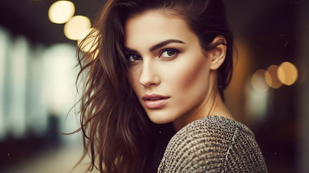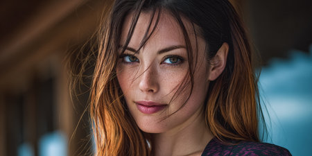 A woman gazes directly at the viewer showcasing her striking eyes and natural beauty. Her hair falls softly around her face while the blurred backdrop creates an intimate and engaging atmosphere.