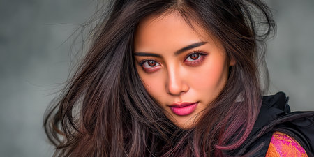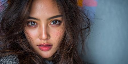 A woman with long, wavy hair looks directly at the viewer, her captivating expression set against a vibrant, colorful backdrop. The lighting enhances her natural beauty.
