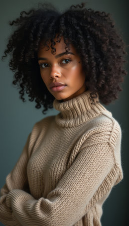 A stunning young woman with voluminous curly hair poses gracefully in a soft beige turtleneck sweater, exuding warmth and confidence. Her captivating gaze and natural beauty create an inviting atmosphere, perfect for showcasing fashion and individuality.