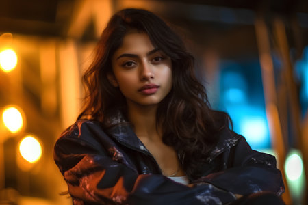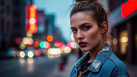 A woman stands outdoors, the focus on her face with a denim jacket. The background showcases blurred bokeh lights, hinting at a bustling city scene, day or night. The image features a shallow depth of field, with soft lighting and a focus on the subject, suitable for various editorial and commercial applications.