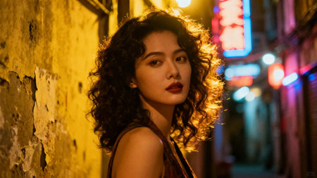 Portrait of beautiful girl with curly hair at night in the city